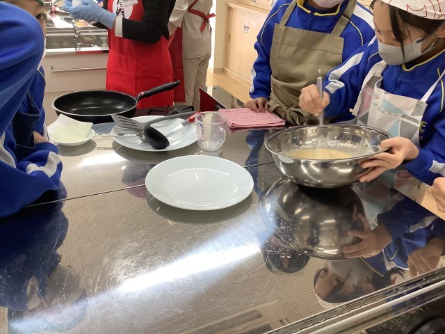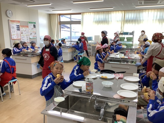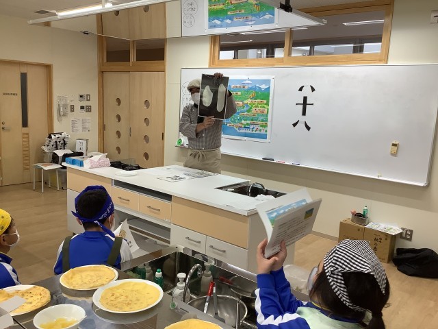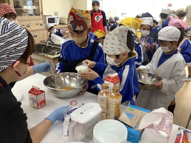 今日から3日間、JAふくしま未来さんが来校してくださり、食育の学習が行われます。本日は1組でした。職員の方々と女性部の方々がおいでくださりました。初めは恐る恐るでしたが、流れが分かるといつもの元気を取り戻し、みんなで協力して作ることが出来ました。焼き上がるにつれ、「いい匂い!」「すごーい」など声が上がりました。また、お米の種類や農業が自然環境に良い影響を与えているお話を伺うことが出来ました。