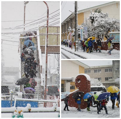 本日(12月16日)朝の雪が降る中、子どもたちは集団登校で元気に登校しました。