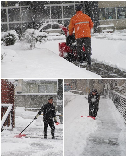 子どもたちの登校前に、朝早くから庁務員の三瓶さんをはじめ、先生方が雪かきを行って、安全確保に努めました。ここでは、子どもたちの登校の様子と雪かきを行っている先生方をご紹介いたします。