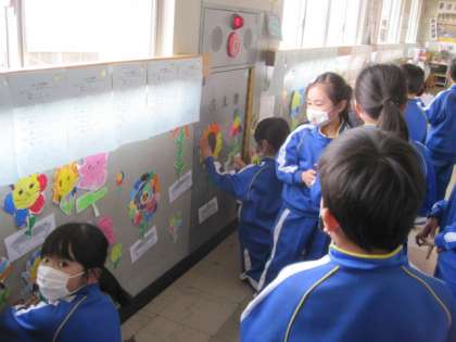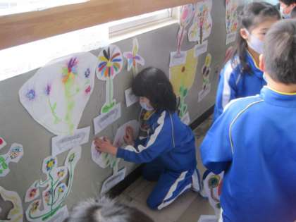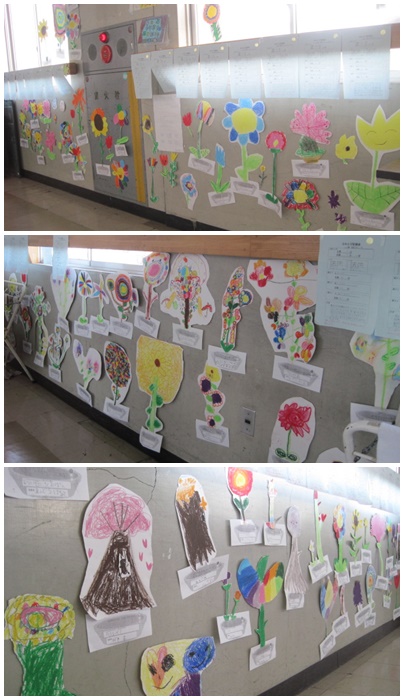 1年生は、図工の単元「こころのはなを さかせよう」で制作した花の絵を、これまでお世話になって6年生の廊下の壁に飾りました。