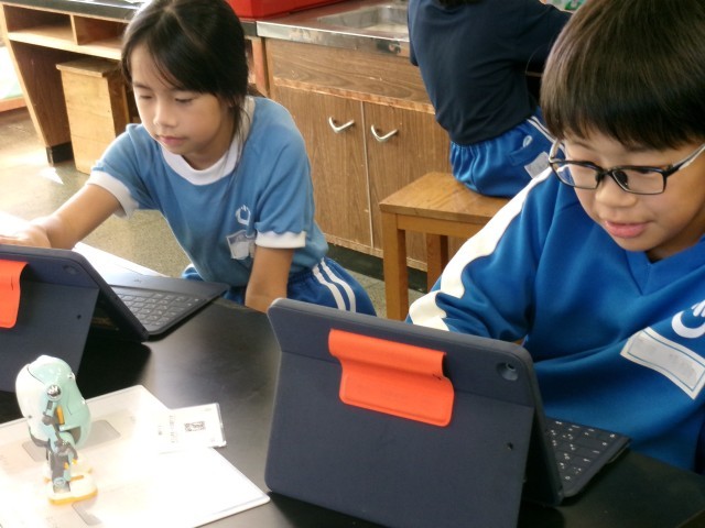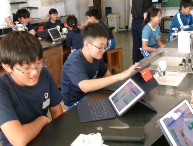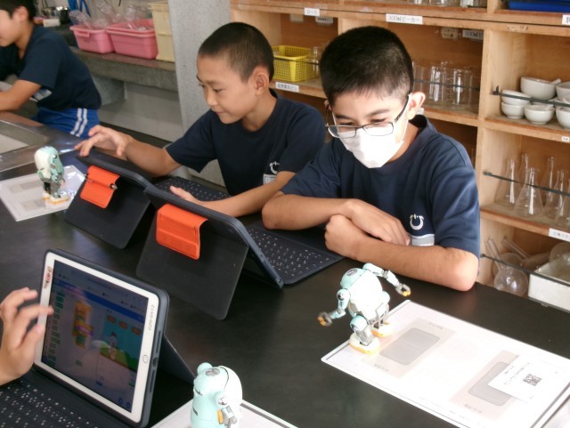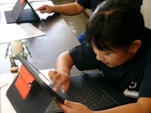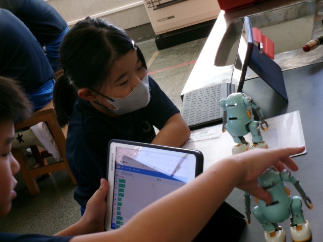 手をあげたりお辞儀をしたり…ロボットの動かし方を考え、自分でプログラミングをしています。