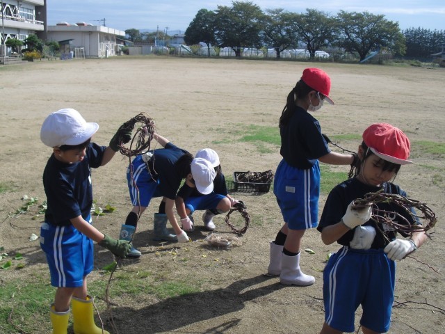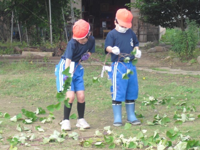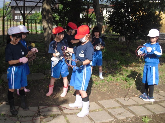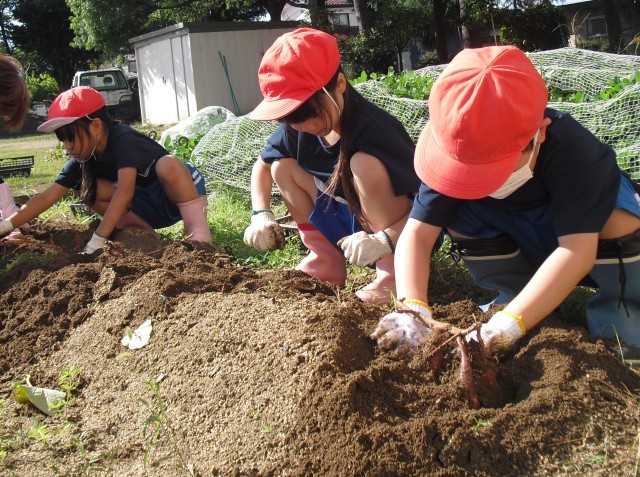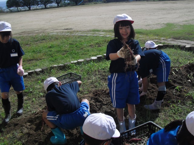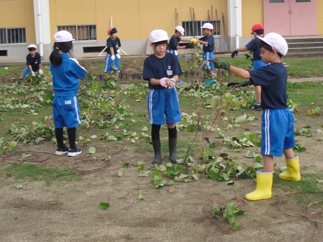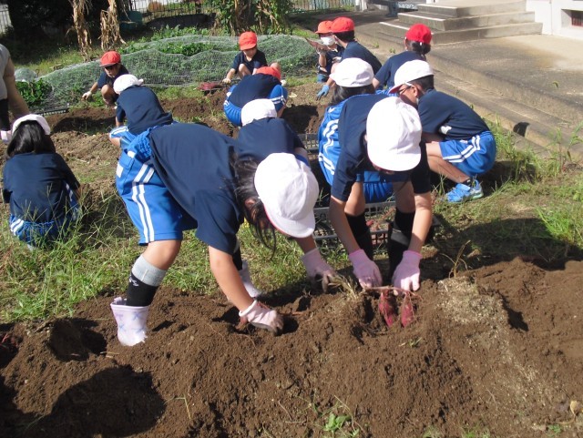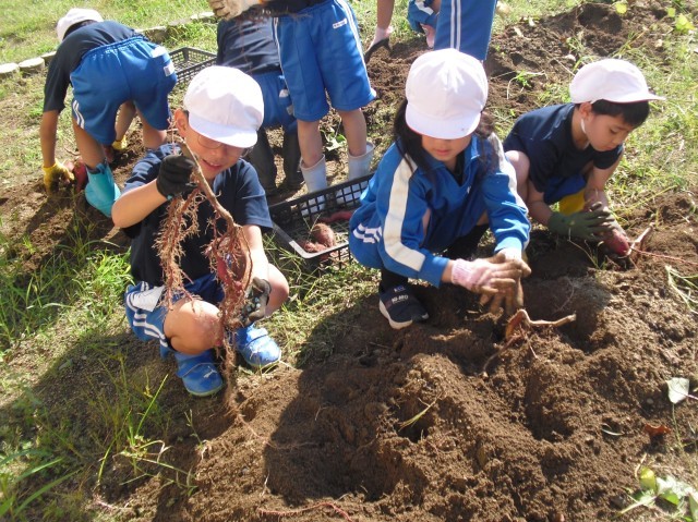 2年生が5月に植えた「サツマイモ」も、いよいよ収穫。サツマイモを傷つけないように気をつけて掘りました。