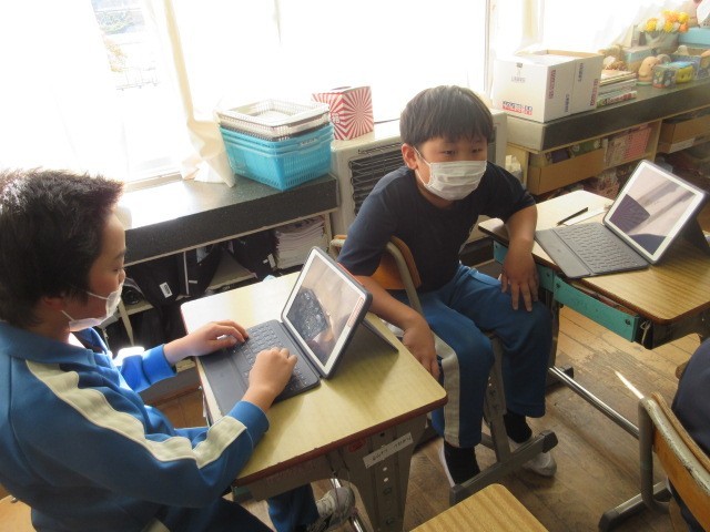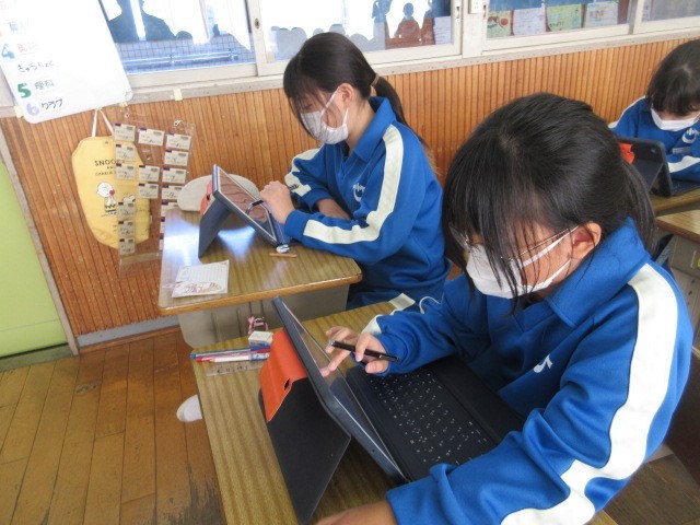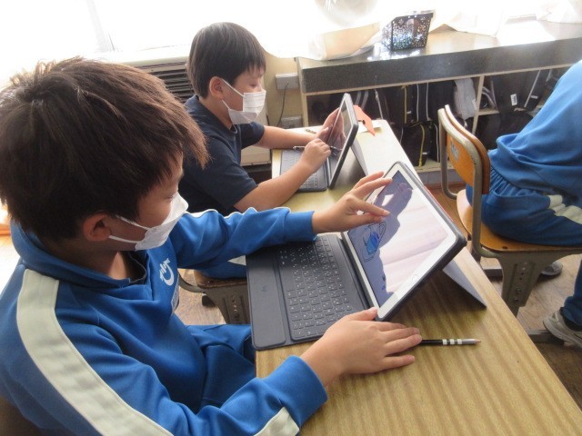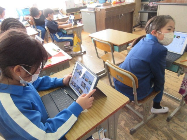 4年生は、国語科の学習で「伝統工芸品」を調べ、タブレットを活用しながらリーフレットにまとめていました。文章に写真やイラストを加え、すてきなリーフレットを仕上げていました。
