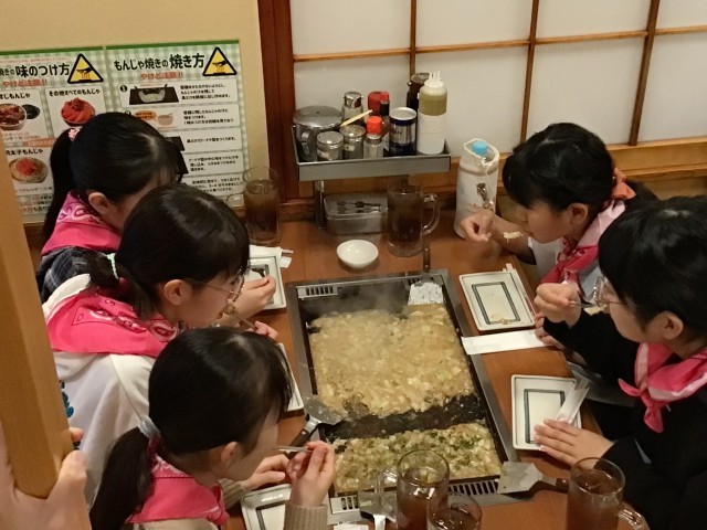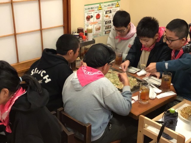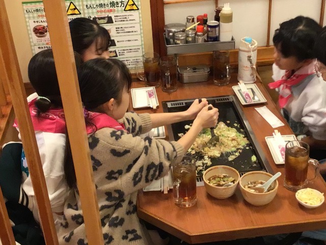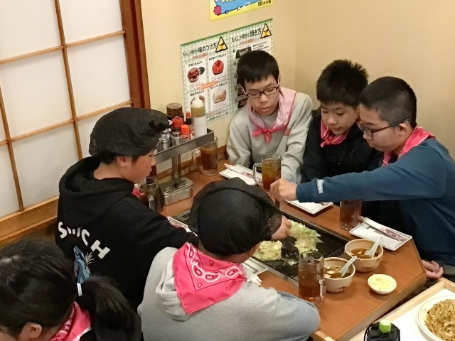 今日の昼食は「もんじゃ」。自分たちで焼いて食べます。