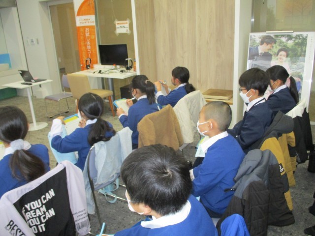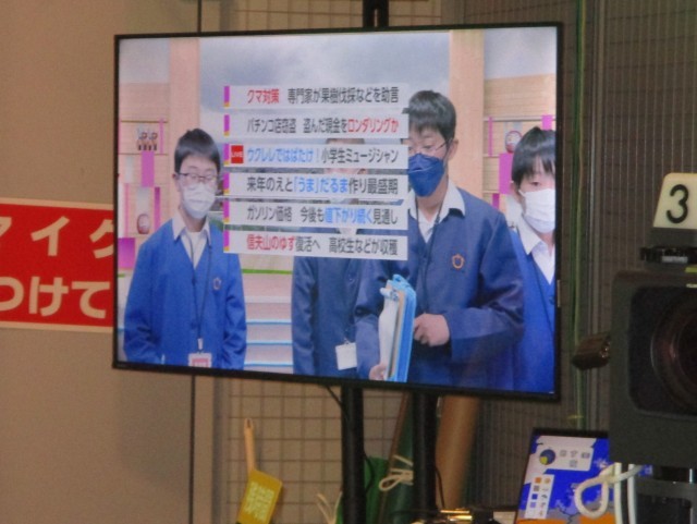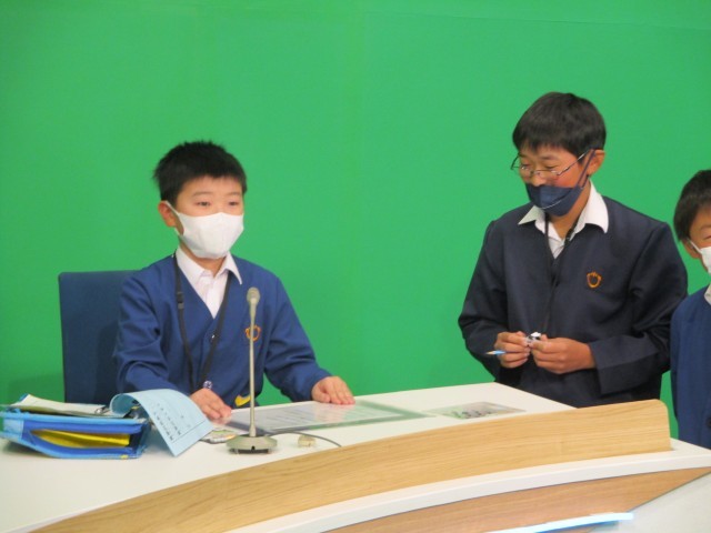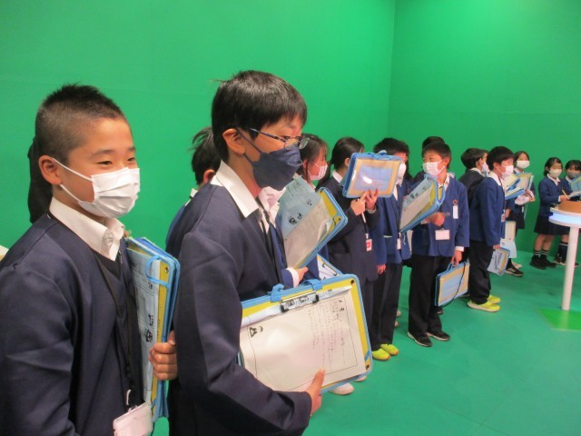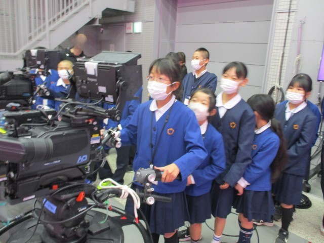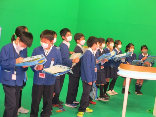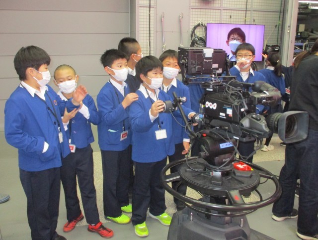 テレビ番組のつくり方について説明を受けた後、アナウンサーやカメラマンの体験をしました。