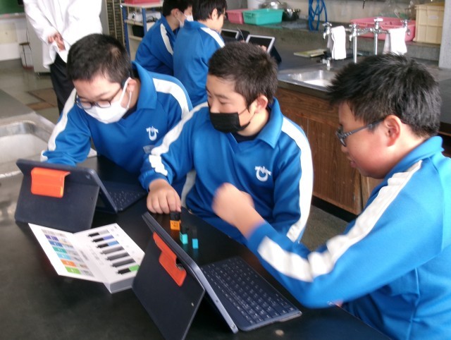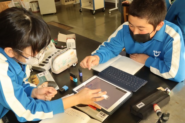 理科でセンサーの仕組みを学習した6年生。実際に、自分たちでプログラミングを組み、MESHを作動させています。