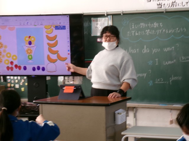 自分の欲しい物と数を英語で尋ねたり答えたりする学習をする4年生。