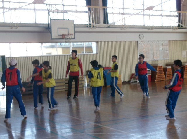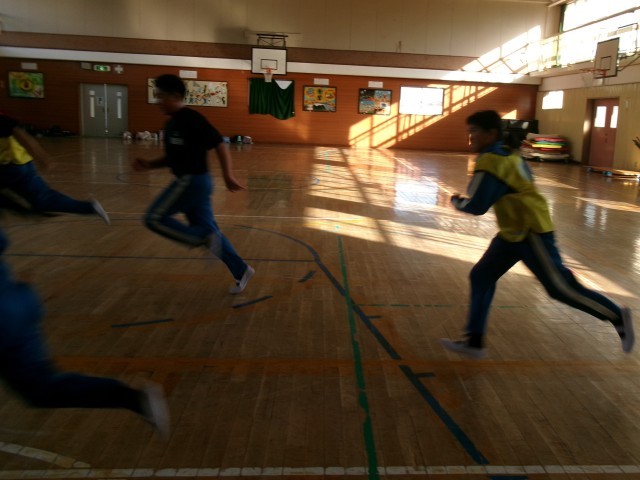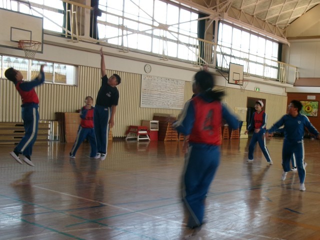 縄跳びで体力をつけた後は、グループ対抗バスケットボールで汗を流します。