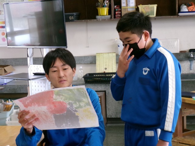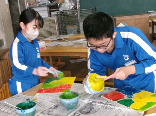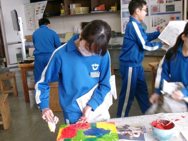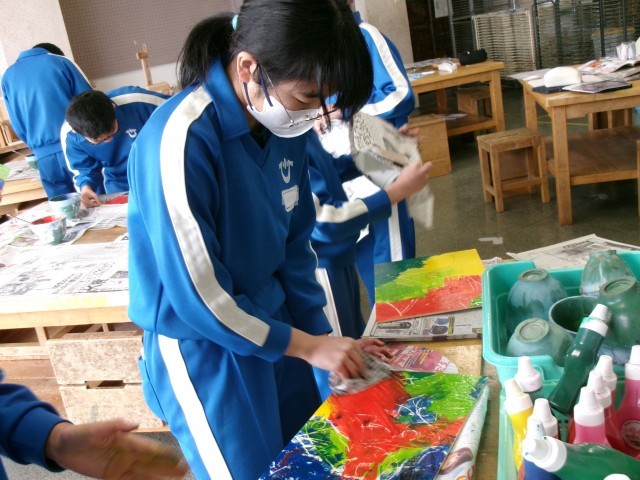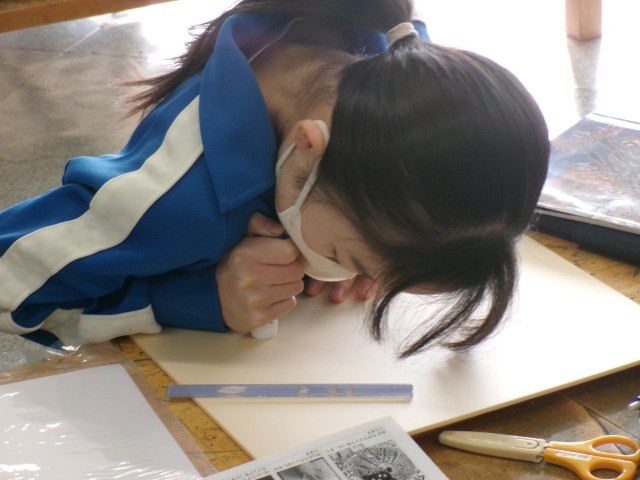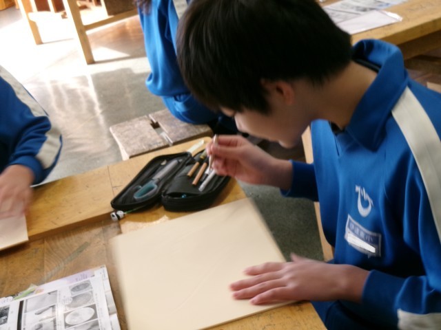 スチレン版画に挑戦。筆箱に入っている物を利用して背景をつくり、出来上がりを確認します。