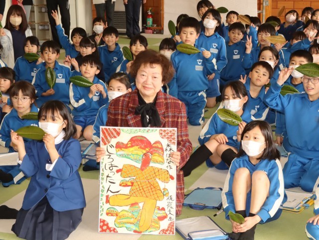 「津波を受けた家から奇跡的に残った一冊の本。この話をもとに、今でも葉にかいたメッセージを海に流しています。」