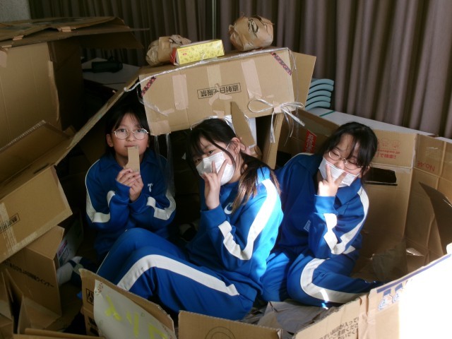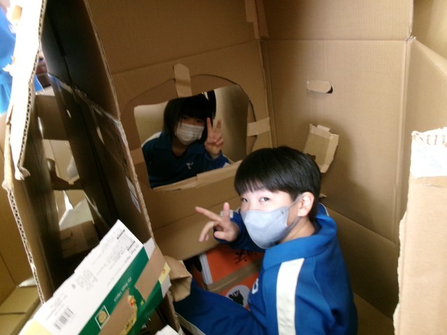 部屋いっぱいの段ボールを使って、自分たちも入れる空間を作り上げました。