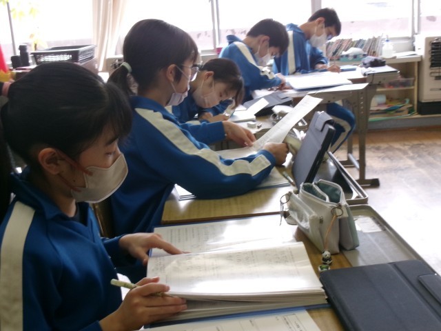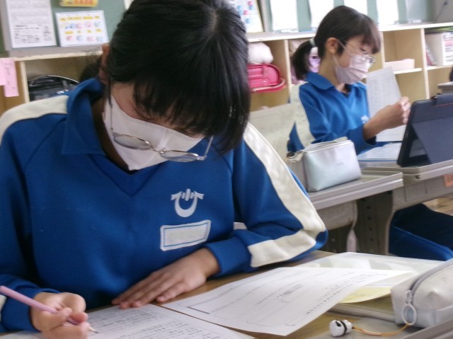 今までの記録をもとに、自分の成長をキャリアパスポートに記入しています。