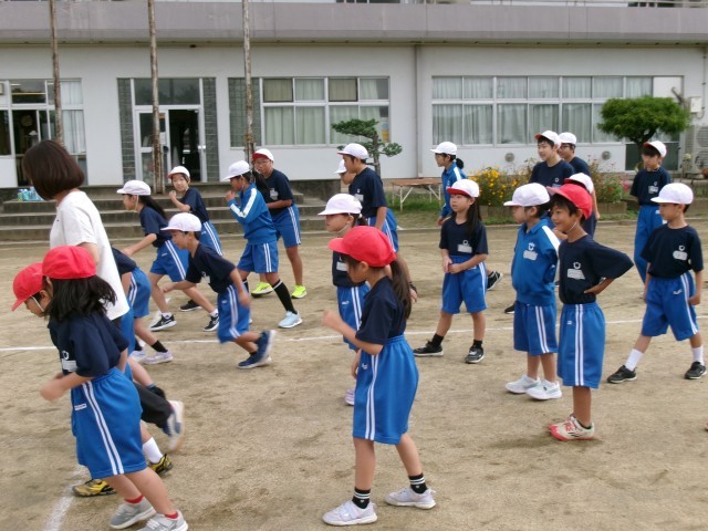 今週から、健康タイムでは5分間走に取り組みます。今日の目標は何周? 自分の目標を友達に伝え、走り出した子供たち。自分のペースで5分完走を目指して頑張ります。