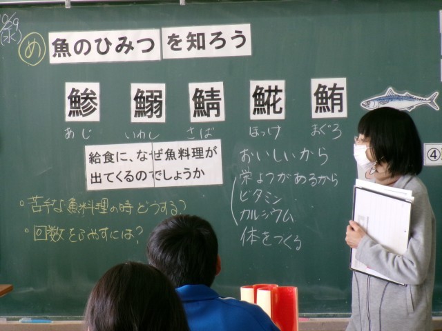 今日の栄養教室は「魚の秘密」。魚には成長に必要な栄養が多く含まれていることを学んだ5年生。魚が苦手な人はどんな工夫をすると食べられるようになるか、みんなで話し合いました。