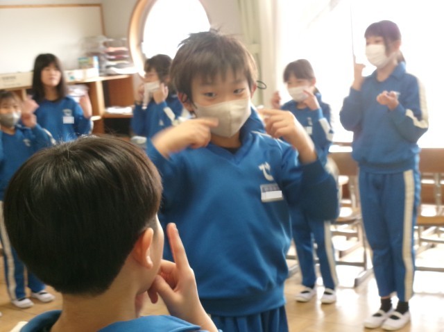 「head」「shoulders」「red」「black」など、4年生の外国語活動では、歌に合わせて踊りながら体の各所を発音したり、ゲームで色の名前を言ったり楽しく学習します。