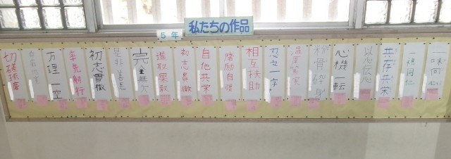 階段の踊り場に、とてもすてきな四字熟語が並んでいます。3学期、全校生の目標として掲げた「有言実行」。自分ならば? 5年生が自分が目標としたい四字熟語を探し出し、みんなに披露しています。