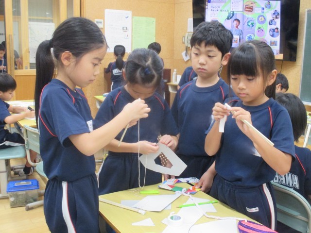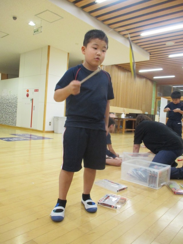 2組のみんなが作っているのは紙けん玉。うわー、楽しそう!画用紙にあいた穴が小さいと難易度アップ。たこ糸の長さも大きなポイントのようです!さあ、どのけん玉が一番楽しめたかな?