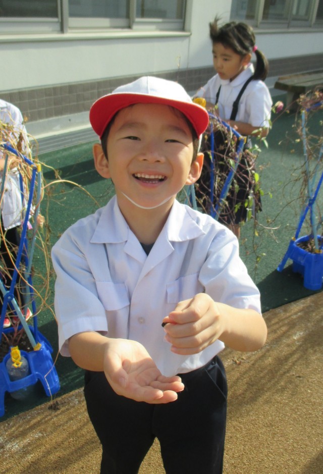 手にしているのはあさがおの種。実りの秋、到来ですね!「先生もそうぞ」と、おすそ分けしてもらいました。ありがとう!