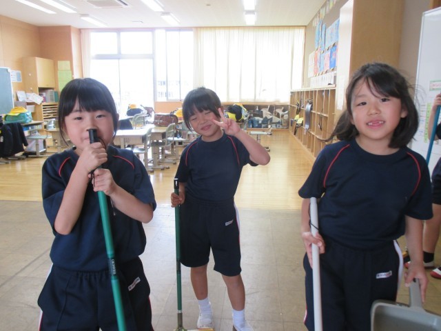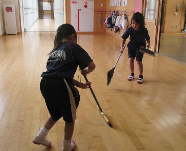 お昼休みにもかかわらず、お掃除をしているのは1年1組の3人さん。ほうきの使い方も上手です!これでバッチリ、ピッカピカ!いいこと見つけてできるって、すばらしいね!