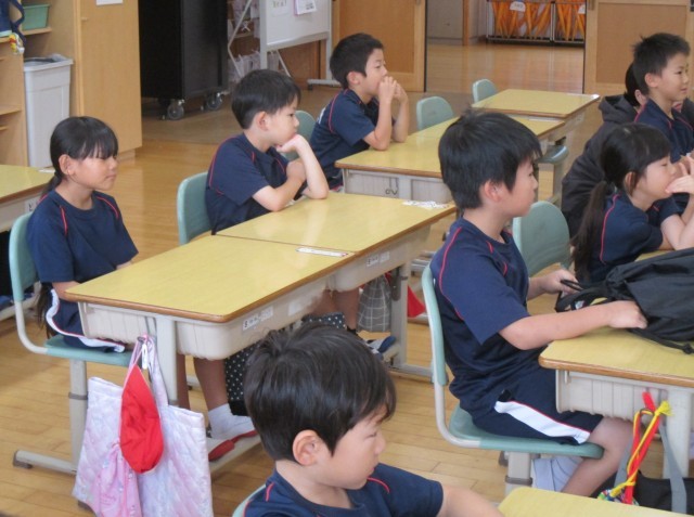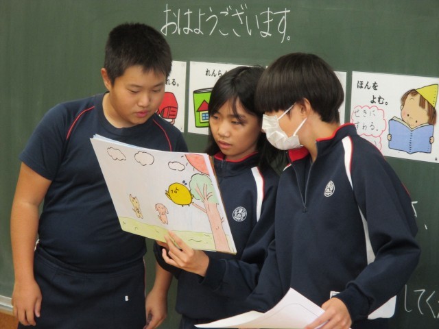 今朝は6年生が低学年の教室に登場!1年1組の教室では、1組の6人がオリジナルのお話を手作り紙芝居で読み聞かせしてくれました!お話を楽しむとともに、改めて6年生のすごさを実感した1年生なのでした。