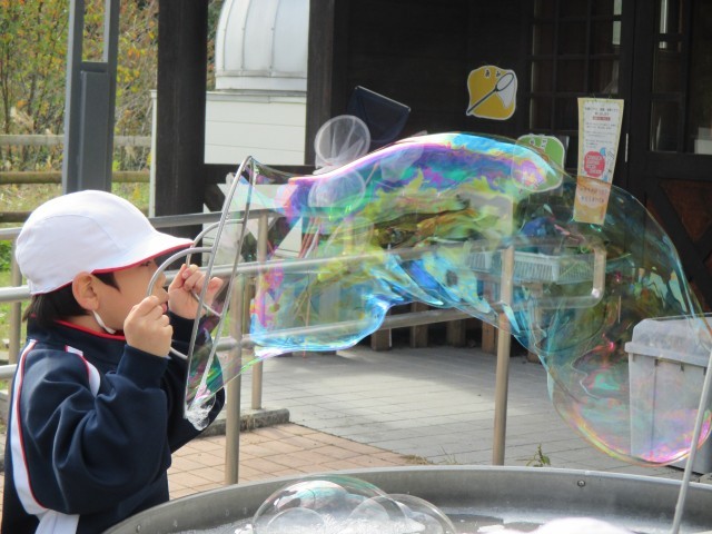 今日はお天気にも恵まれ、外でたーくさん遊ぶことができました!虫も葉っぱも木の実もあって、たくさんの秋を見つけることができたね♪それにしてもこのシャボン玉、すごくないですか!?