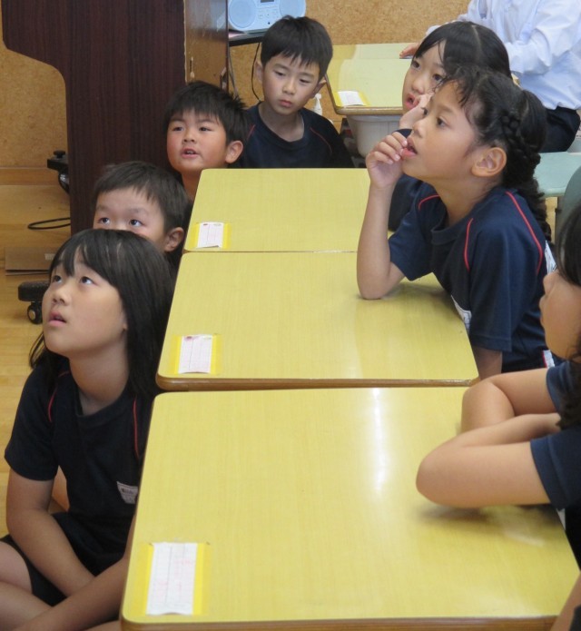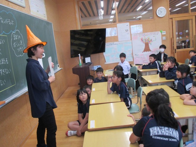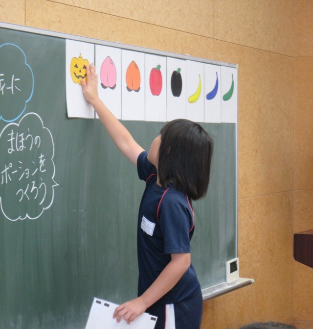 今日の2年生はハロウィンパーティーの日!こちらは2年1組の授業の様子ですが、なんと英語を取り入れての学級活動だったんですよ!この後、さらに楽しいことが待っていたのですが、さあ、何だと思いますか!?