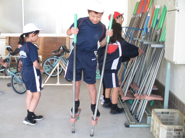みんなの授業中、庁務員さんが竹馬の調整をしてくださっていましたよ。おかげで休み時間は思い切り楽しく過ごすことができます。校内で見かけたら、そっと伝えてみましょう。日頃の感謝をありがとうの言葉で♪