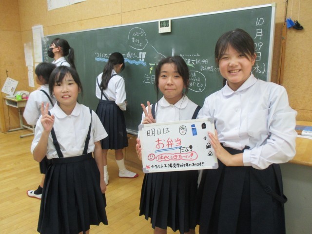 明日もお弁当です!あら、5年生はヤクルト工場に見学学習に行くんですね!それはダブルで楽しみですね♪おうちの方、愛情たっぷりのお弁当、よろしくお願いします!