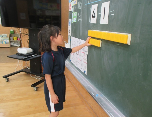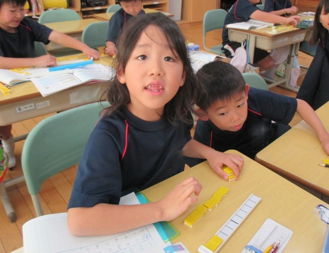 1年生はひき算の学習パート2に入りました。1年生の計算はブロック操作をして、10のまとまりを意識するのが大事!何度も練習したので、ほら、黒板でしっかりやり方を説明できるようになったね!