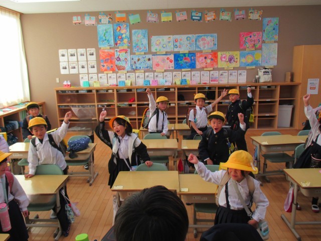 1年1組の帰りの会。日直さんが「明日の持久走がんばるぞー!」とかけ声をかけると、みんなが「オー!」と返していました。さあ、明日は何人が自己新記録を出せるかな?乞うご期待!