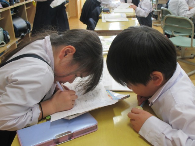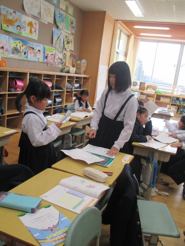 2年1組では、あちらからもこちらからもかけ算九九を唱える声が聞こえてきます。そう、名人を目指しているんです!お互いに聞き合って、サインをし合って、すばらしいね!