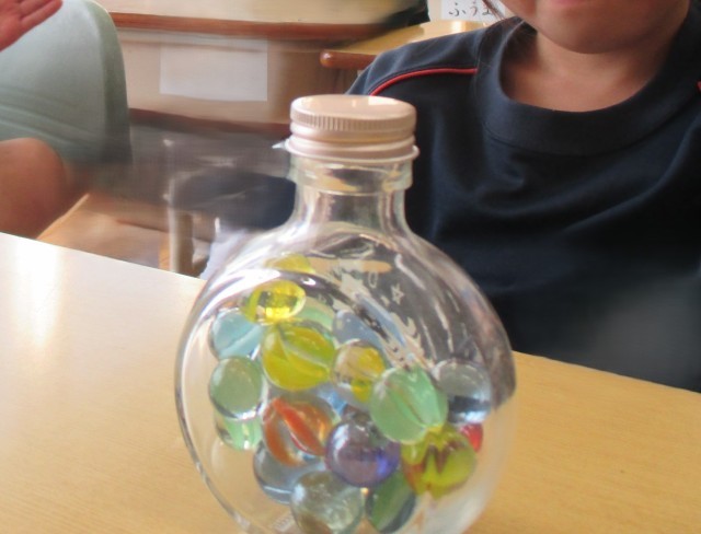 あいさつに力を入れている梁川小学校。朝はボランティア委員が正門に立ち、お昼の放送であいさつ名人を発表しています。1年生も授業の時はもちろん、給食時も「しっかりあいさつ」を意識!1年1組にあるこのビー玉はがんばりの証♪