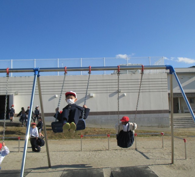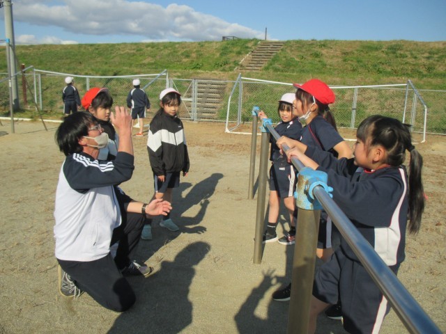 今日もとってもいい天気!お昼休みはたくさん遊べる木曜日、校長先生に鉄棒を教えてもらっている3年生発見!これできっと、どんどん上達するはずです!