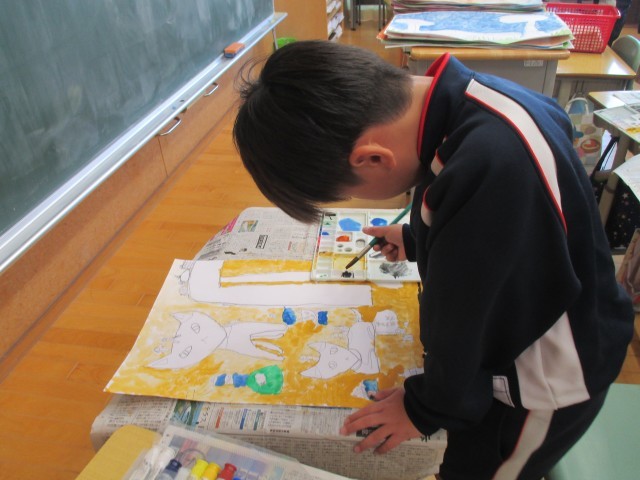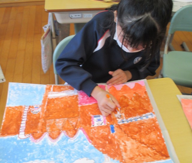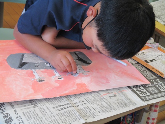 4年生が絵を描いていましたよ。目も、手も、体も全神経を集中して仕上げにかかっています。集中する姿ってかっこいい♪