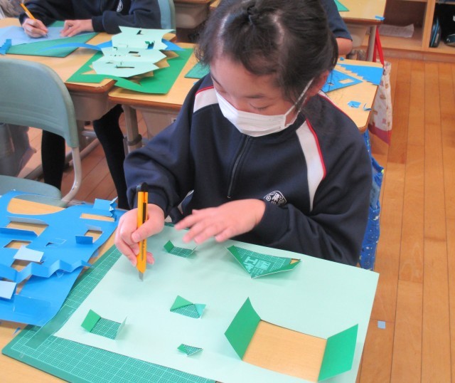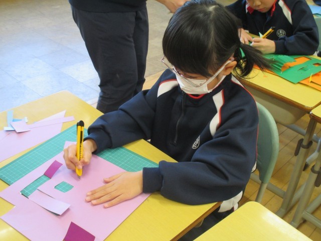 2年生がカッターを上手に使って工作をつくっていたよ。手を切らないように注意しながら。でも怖がらずに、細かい模様をた~くさん切っていて、みごたえのある作品が続出です。