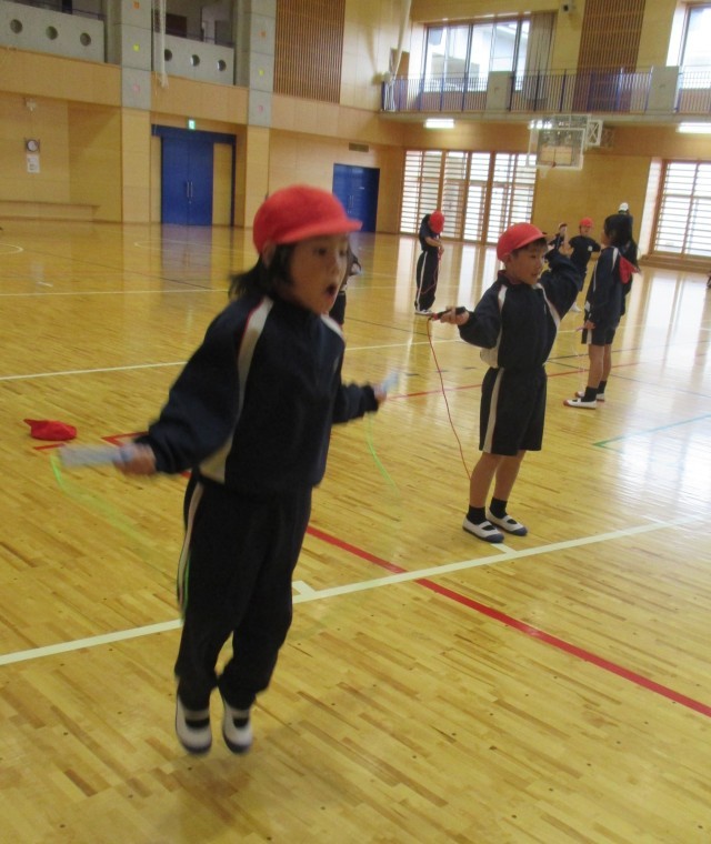 アリーナでなわとびをしているのは1年生。みんな、今どれくらい跳べるのかな?45分の授業の中でも、どんどん跳べる回数が増えていく1年生。さあ、これからどのくらい跳べるようになるのか楽しみです!