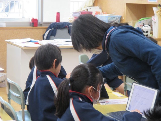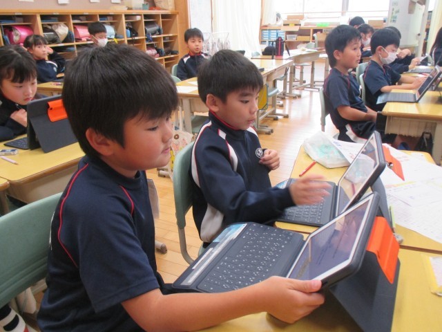 1組のみんなが情報モラルについてのアンケートを、タブレットを使って実施中。難しい言葉も出てきましたが、なんとか回答終了できました!こうして、操作方法とともに言葉も覚えていくんですね。