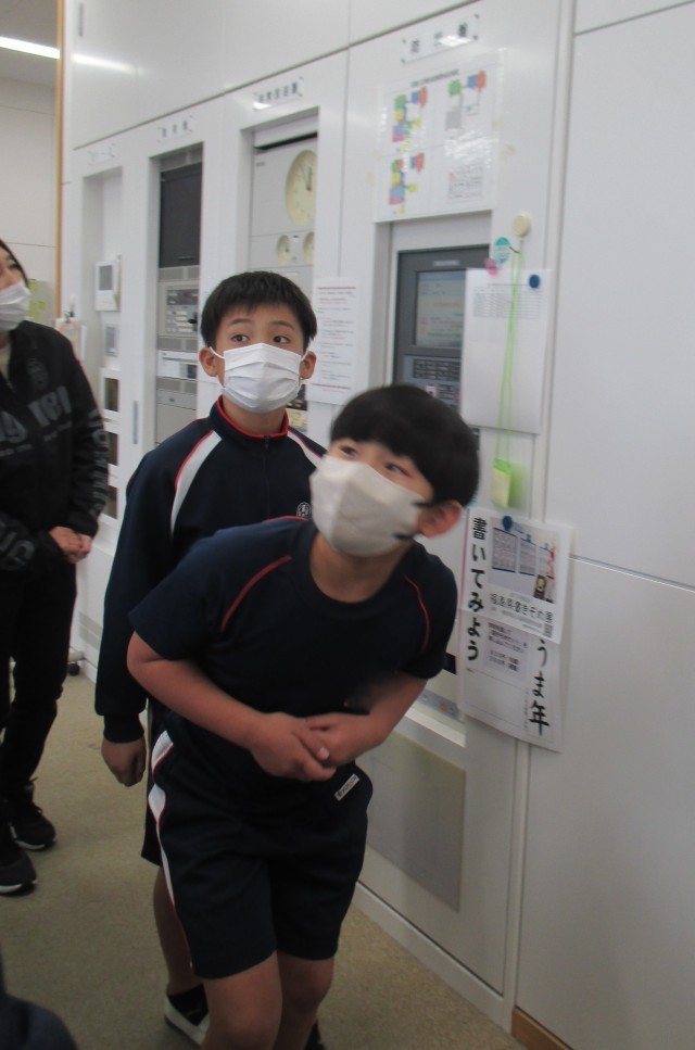 校内の消火器や防火シャッターなどを調べている1組のみんなが、校務センターにやってきました。お目当ては、「防災盤」と呼ばれる、火災の場所を知らせる設備。「これか!」今日も新たな発見がありましたね!