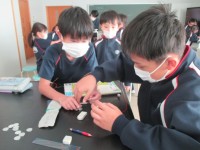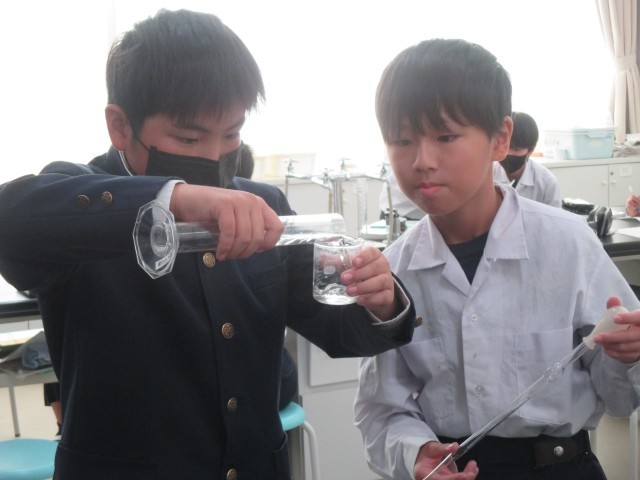 今日のミッションは2つの物質を見分ける方法。どちらも見た目は白く、水に溶ける物質。さあ、どうする?じゃあ、溶け方を比べてみよう!5年生の実験力、考察力、説明力、ぐんぐん高まってるね!