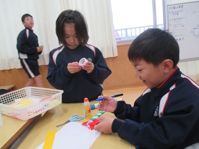 楽しそうに作っているのは何かな?手元をよーく見てみると?あれ?サンタクロースが見えますね!どうやら教室の飾りを作っているみたい!これで12月の雰囲気、バッチリですね♪