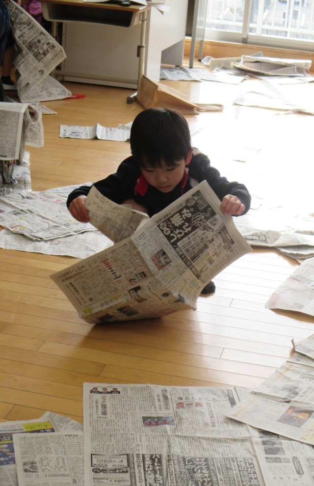 2時間、新聞紙で目一杯遊んだ1年生。その中でもほのぼのするワンシーンを集めてみました。1年生は、一つ一つが勉強で、一つ一つがかわいいんです♪