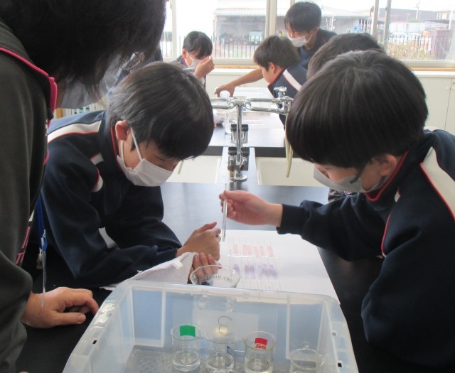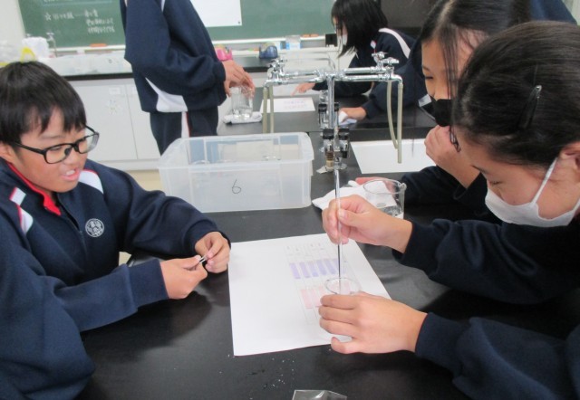 6年生の理科では水溶液の性質を学習中。今日はリトマス紙を使った実験です!「わー、変わった!」「おー、これは変わんない」いいね、いいね、それが実験!今日もたくさんの発見があったね!