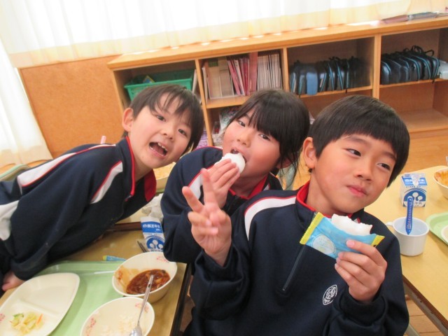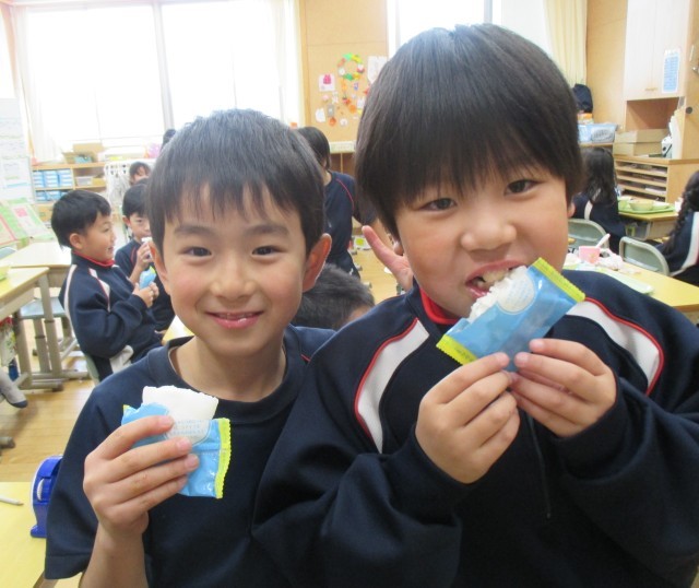 給食に珍しいデザートが出ました。もちクリームアイスです!こんなデザート、1年生は初めて!「また出してください!」そんな声が聞こえてきそうでした。