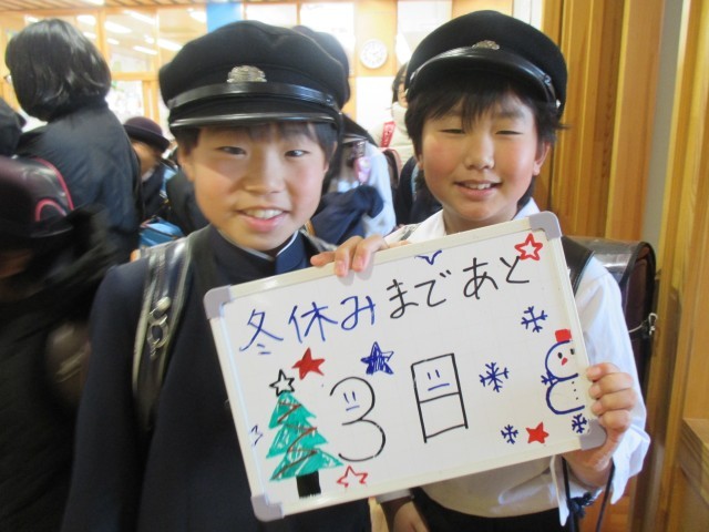 冬休みまであと3日!子どもたちは、少しずつ学習用具を持ち帰っているところですが、今日は風が強くて、1年生は大きな作品バッグに大苦戦!でもこれは冬休みに向けての登竜門!がんばろう、あと3日!