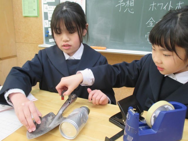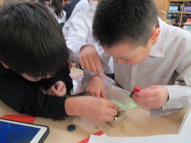 昨日の1組に続き、今日は2組がじしゃくにつく物を探しました。画びょうはつく?つかない?昨日、議論があったところですが、今日の実験結果を見ると、画びょうはおもしろいようにじしゃくにくっつきました!次回は、どうしてかな?を考えます。
