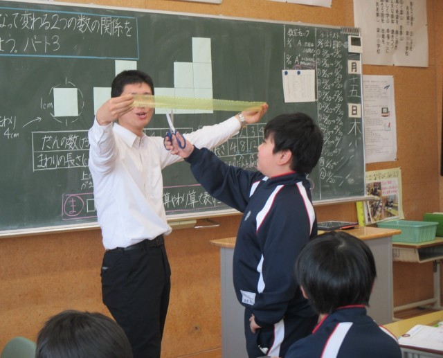 1本のひもを1回切ったら2本に、2回切ったら3本に、3回切ったら何本になる…?2つの数にはどうやらあるきまりがあるみたい!今日も○や□を使って式に表そう!そんな学習も今日が最後。明日はいよいよテストです!