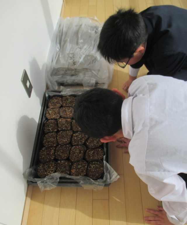 2年生が校務センター前に置いてあるポットをのぞいています。何かが芽を出したようですよ!さあ、何の芽か分かるかな!?知りたい人は校長先生に聞いてみよう!
