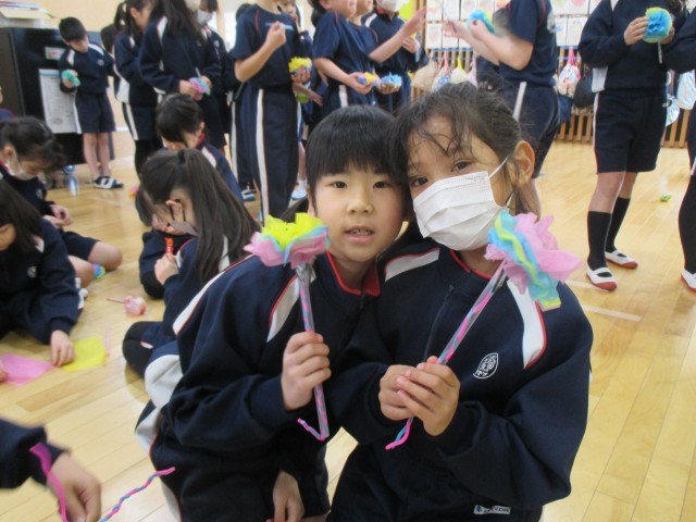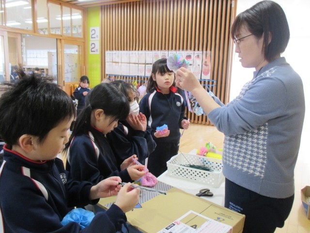 2年生のワークエリアは、モールとお花紙で作ったかわいいお花がいーっぱい!身の回りの材料でこんなにきれいなお花も作れるんですね♪でも、いったいどこに飾るのかな?