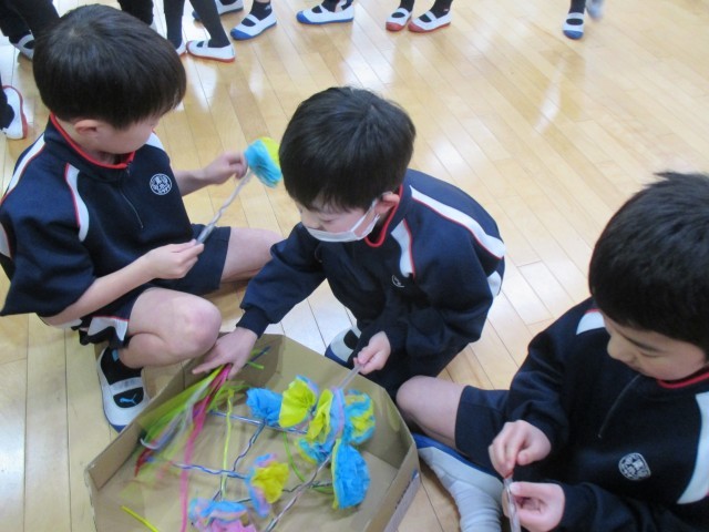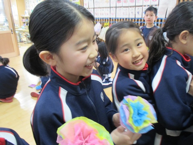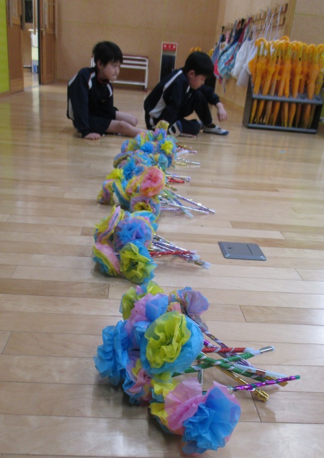 2年生がお花作りをしています。それにしてもたくさんある!2年生の人数よりもたくさんある!いったい誰にあげるのでしょうね。それは火曜日、明らかになるのでお楽しみに♪