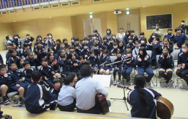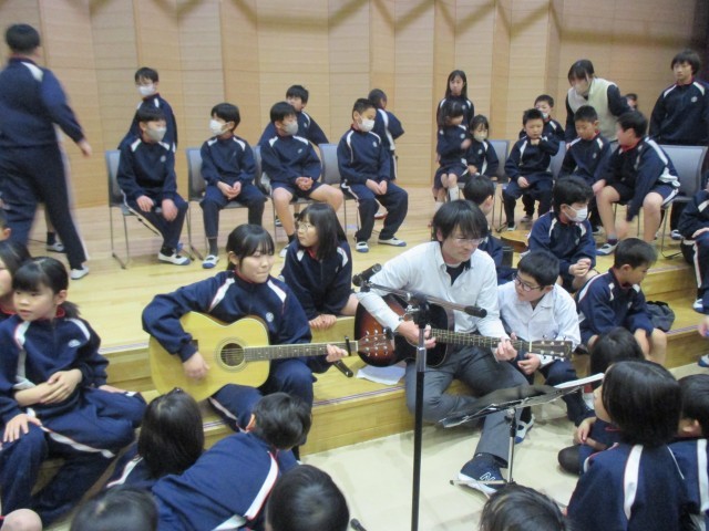 お昼休み、みんなぞろぞろ講堂に向かっています。その訳はライブがあったからです!たくさんの観客で埋め尽くされた講堂の中心にはギター片手に歌う6年生と校長先生が!カッコイイー!見逃した人、第2回にはぜひ!